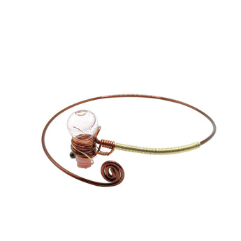 CalmClasp Armlet is a sophisticated wearable device designed to mitigate feelings of excessive and sudden anxiety and stress, promoting a sense of calm and emotional stability. It is made of copper, brass and has a small sphere contains alchemical liquids and a small gold leaf.